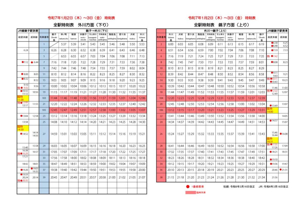 2025年1月1日 JR銚子駅7時42分発の特急しおさい号にご乗車予定のお客様は、犬吠駅7時19分発の列車までにご乗車ください。