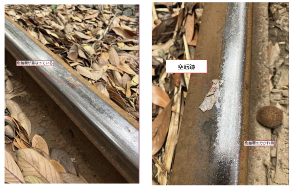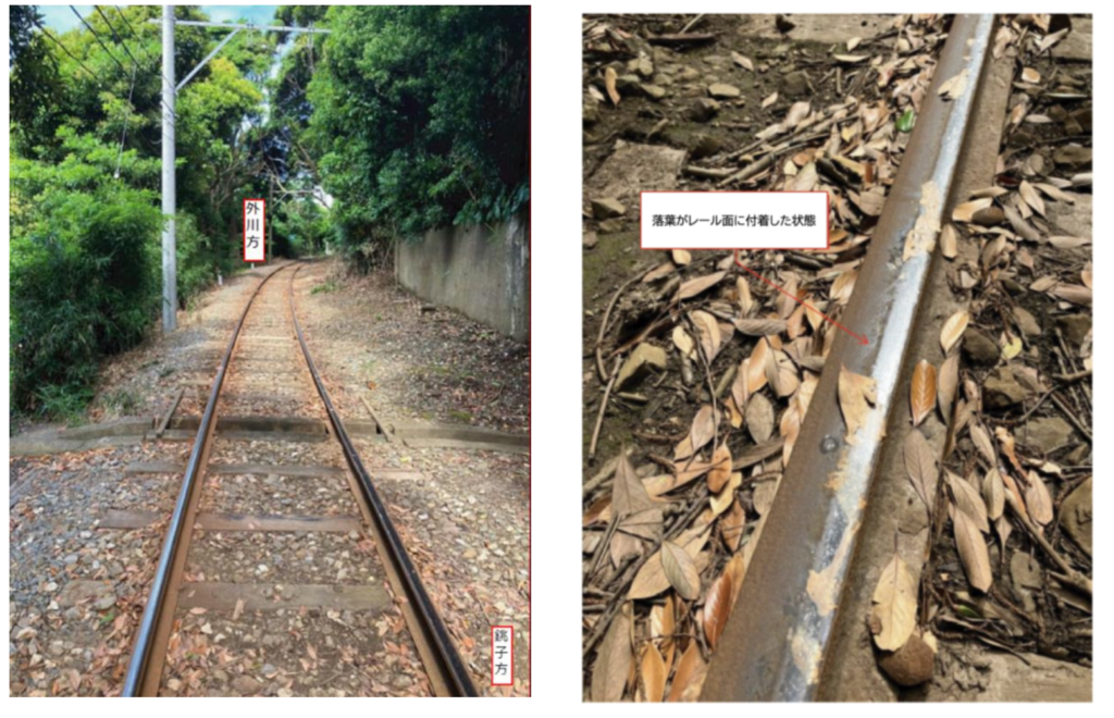 沿線樹木の落葉がレール面に付着し、列車通過時に踏み潰されることで、落葉成分(タンニン)とレール(鉄)の反応が繰り返されます。これにより黒色の被膜(タンニン鉄を含む)が形成され、朝露や塩害の影響で樹脂化して車輪が滑りやすい状態となり、遅延の原因となっていました。