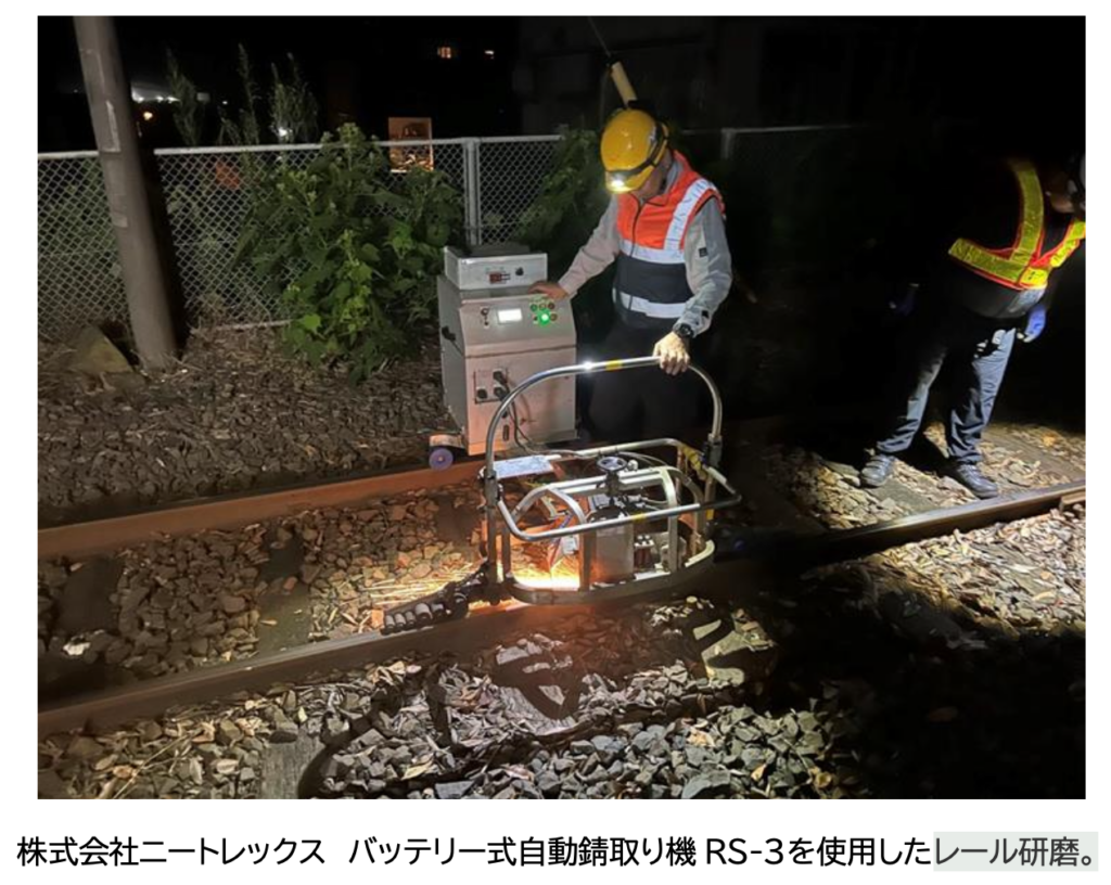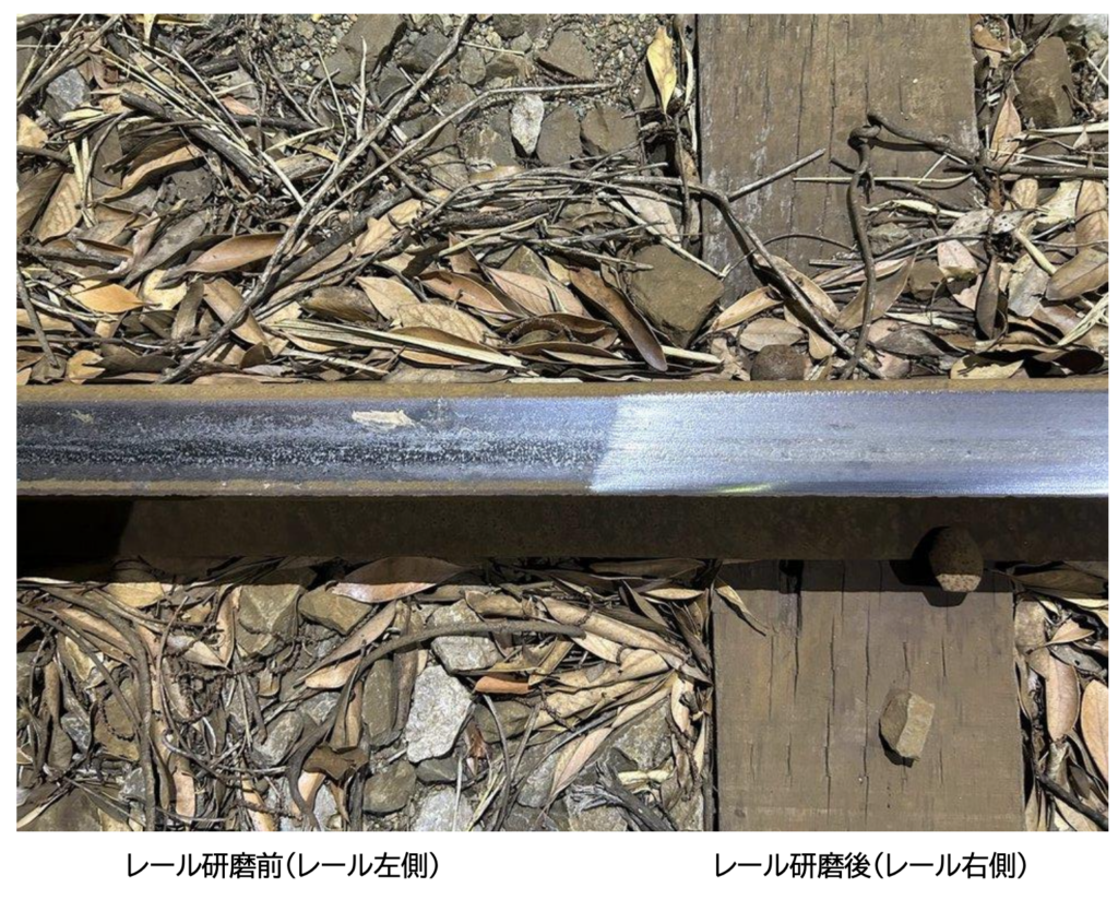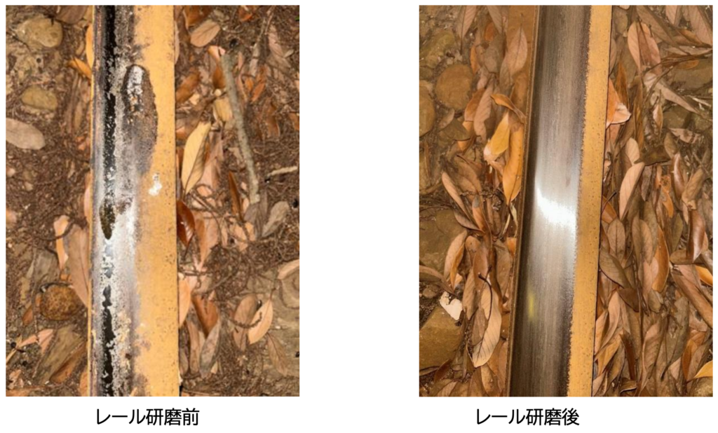 レール踏面を研磨し、樹脂化した黒色被膜を除去。作業には、株式会社ニートレックス様のバッテリー式自動錆取り機「RS-3」を使用しました。実施後はレール表面状態が改善し、当該区間での空転が一時的に改善しています。